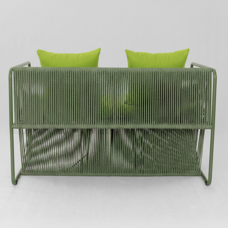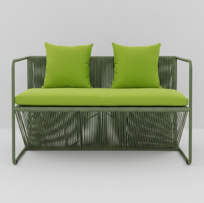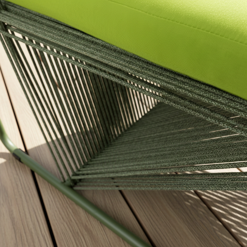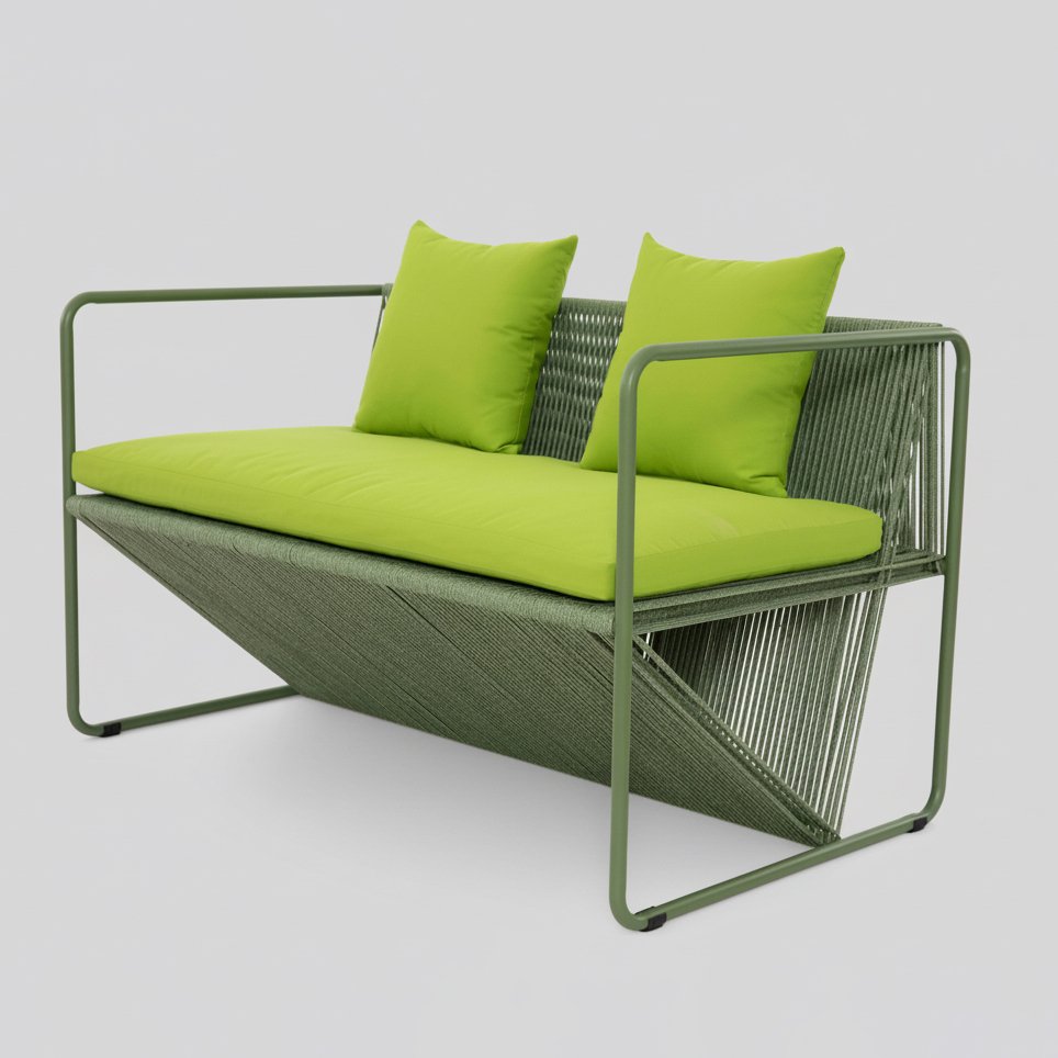 This modern geometric woven armchair features a calming sage green frame that weaves unique architectural lines; paired with vibrant lime colorful cushions, it seems to perfectly blend the tender buds of early spring with the tranquility of a forest into a Sofa.