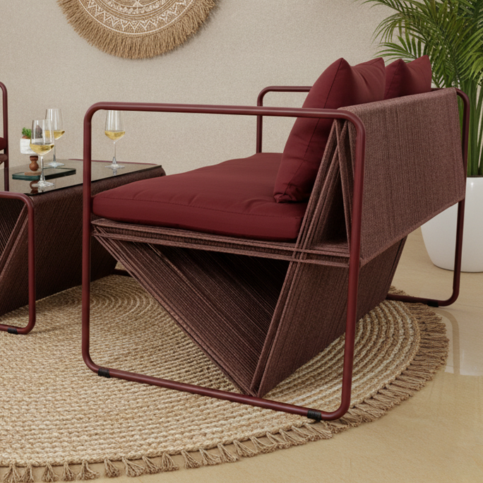 This modern geometric woven armchair features a calming sage green frame that weaves unique architectural lines; paired with vibrant lime colorful cushions, it seems to perfectly blend the tender buds of early spring with the tranquility of a forest into a Sofa.